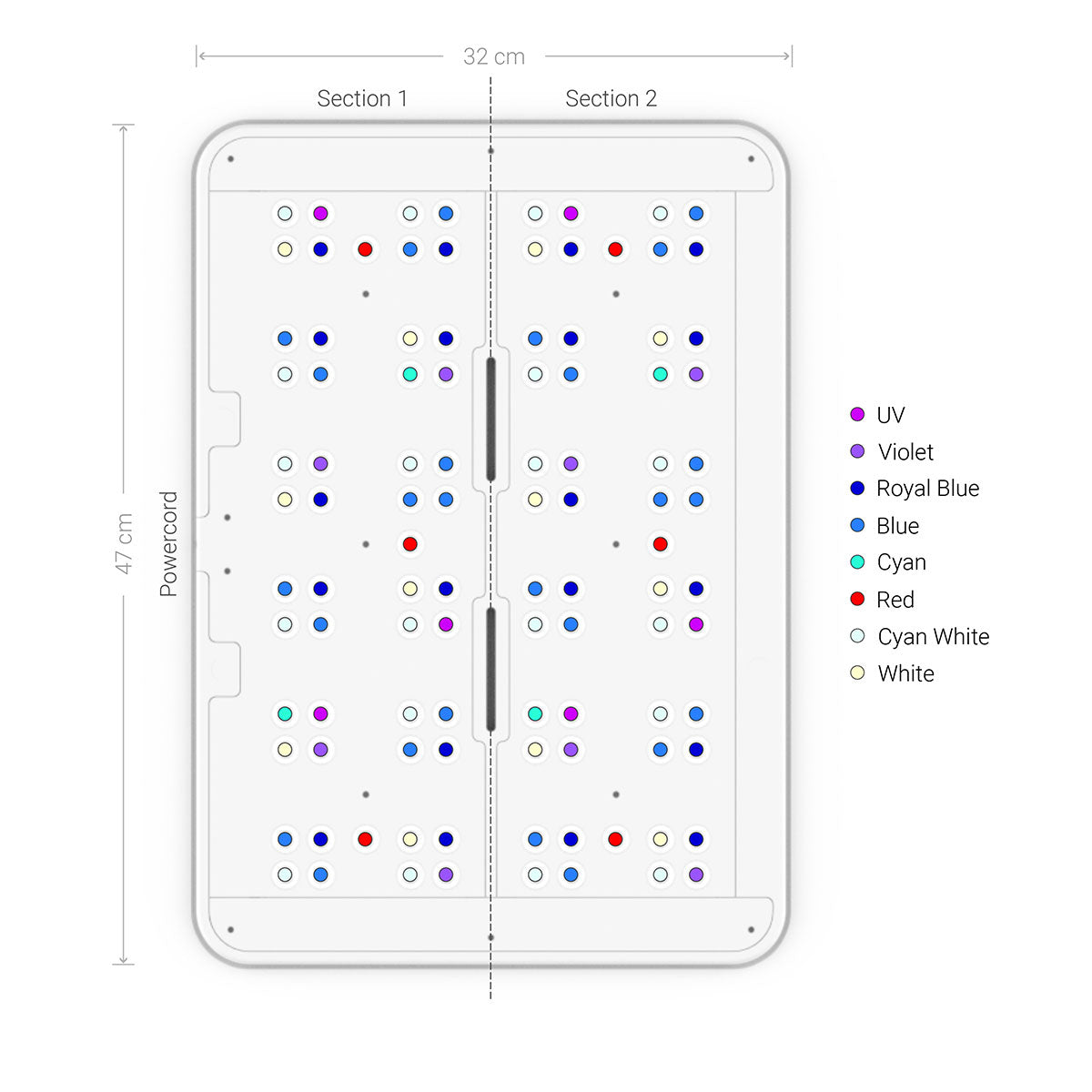 - Number of LEDs: 102; 6x UV 405nm, 8x Violet 420nm, 20x Royal Blue 450nm, 26x Blue 470nm, 20x Cyan White, 12x Clean White, 4x Cyan 500nm, 6x Red