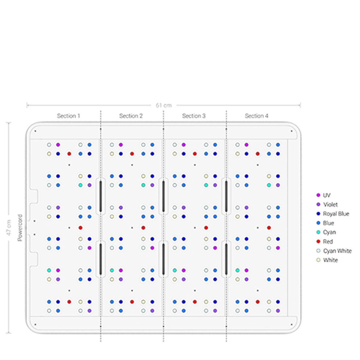 - Number of LEDs: 204; 12x UV 405nm, 16x Violet 420nm, 40x Royal Blue 450nm, 52x Blue 470nm, 40x Cyan White, 24x Clean White, 8x Cyan 500nm, 12x Red